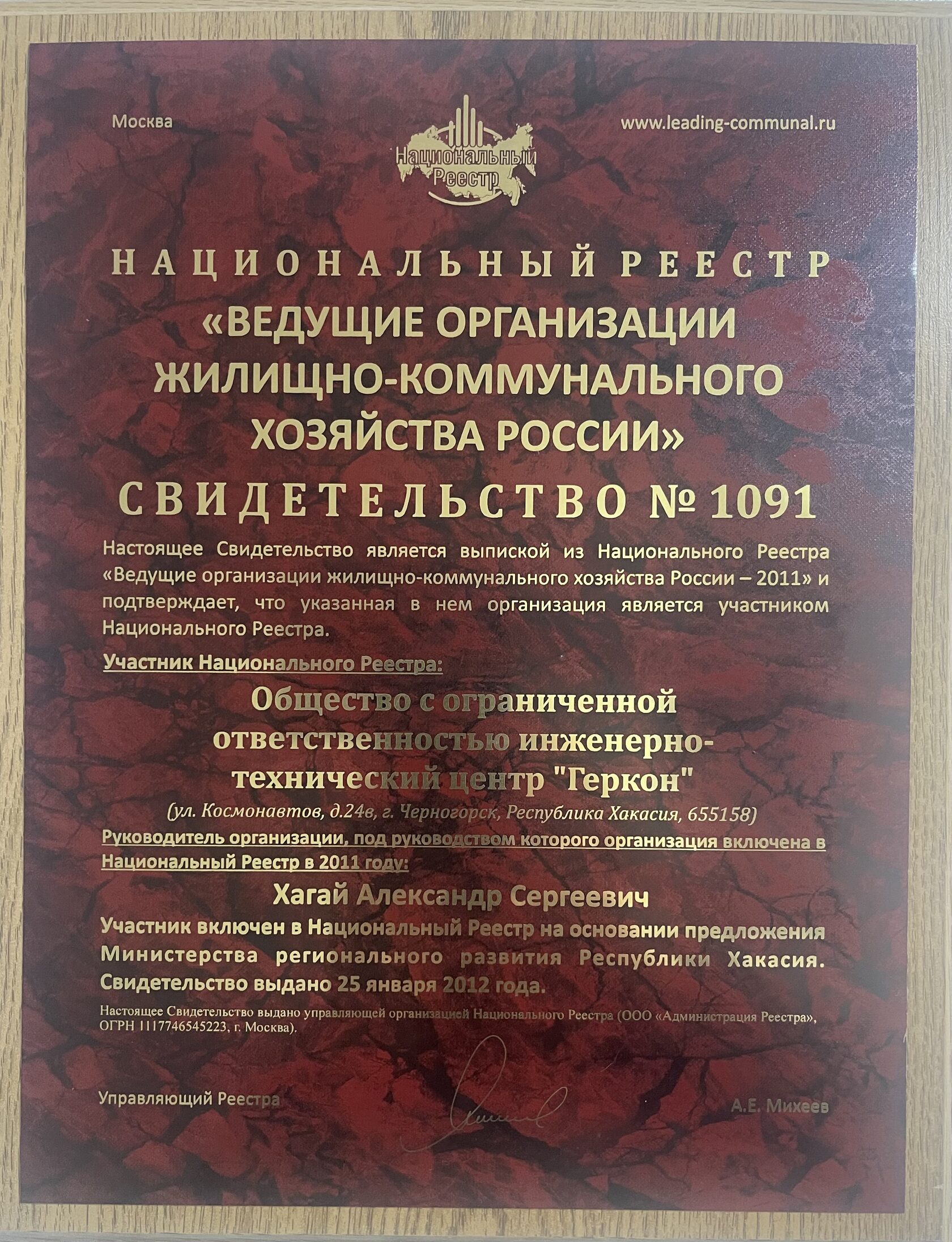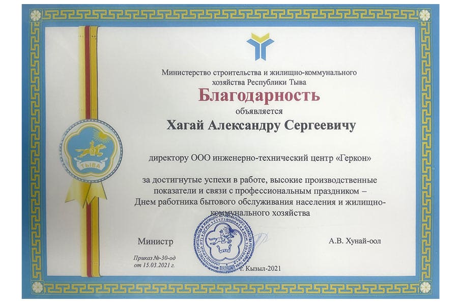 «Знак почетного работника жилищно-коммунального хозяйства России» для руководителя Хагая Александра Сергеевича.
